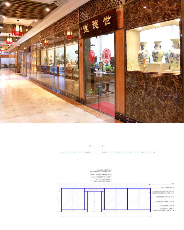 设计根据古玩文化要求,整体采用泰阳SUPER1080系列成品隔断,主型材饰面电泳香槟金拉丝涂层,洋气沉稳有经久耐用;采取泰阳品牌独有的内钢外铝结构,整体隔断更加稳固且防火隔音;采用单玻一侧的隔断形式,走廊一侧规整匀称。这种现代的分隔理念,是能促进并满足各类商企业的需要,满足了其功能性及外观的完美结合,以方便商家展示商品。