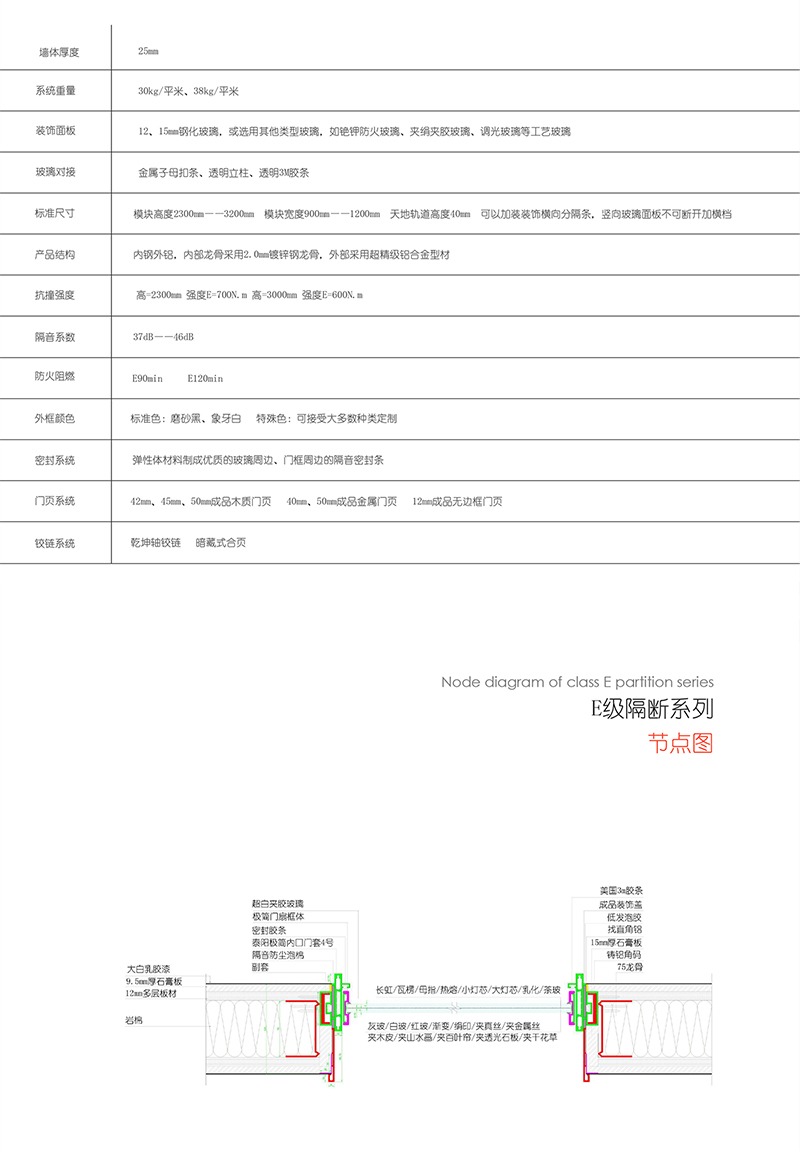 泰阳E级系列隔断是单层安全玻璃从地面直通到吊顶高度的隔断,铝合金型材组件及钢化玻璃连接组装,产品重复使用率能达到85%以上,防火、环保、易安装、可重复利用、可批量生产等特点上明显优于传统隔墙